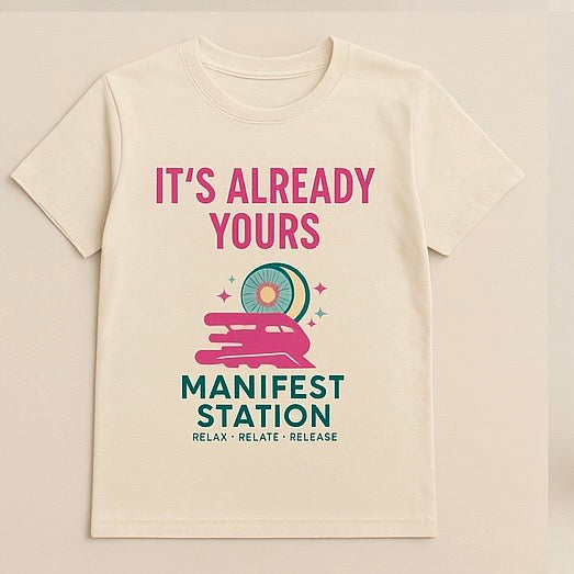 This tee is a whole affirmation. “It’s Already Yours” reminds you (and everyone around you) that your desires are in motion. Ultra-soft cotton, relaxed fit, and full Manifest Station branding make this your new go-to power shirt.